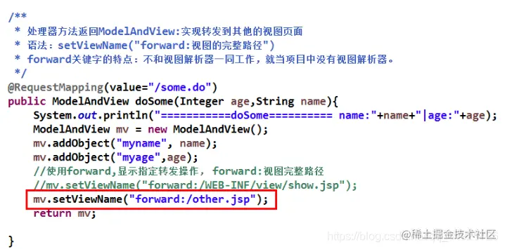 处理器方法返回 ModelAndView 时,需在 setViewName()指定的视图前添加 forward:,且此时的视图不再与视图解析器一同工作,这样可以在配置了解析器时指定不同位置的视图。视图页面必须写出相对于项目根的路径。forward 操作不需要视图解析器。