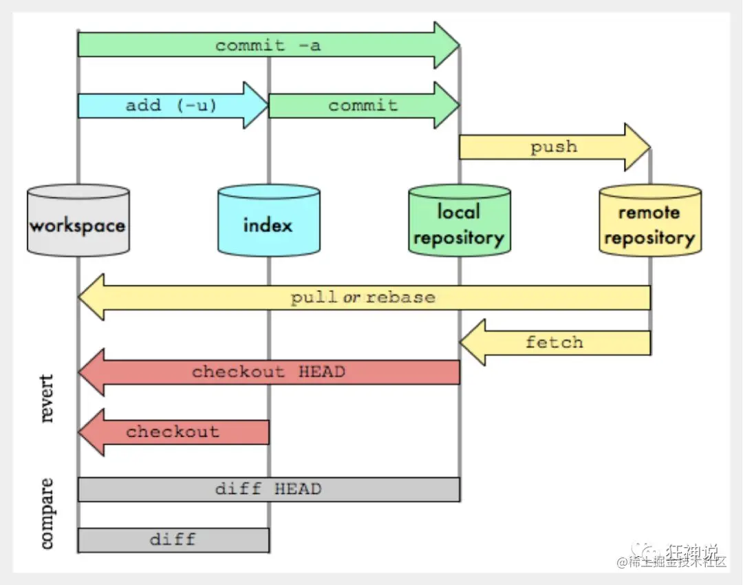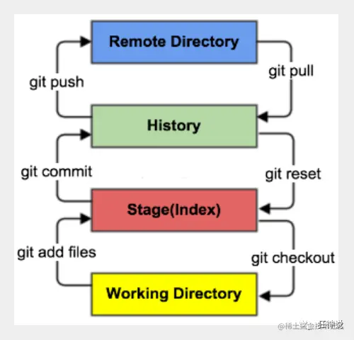 Git本地有三个工作区域:工作目录(Working Directory)、暂存区(Stage/Index)、资源库(Repository或Git Directory)。如果在加上远程的git仓库(Remote Directory)就可以分为四个工作区域。文件在这四个区域之间的转换关系如下: