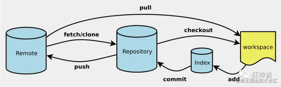 - Remote:远程仓库,托管代码的服务器,可以简单的认为是你项目组中的一台电脑用于远程数据交换