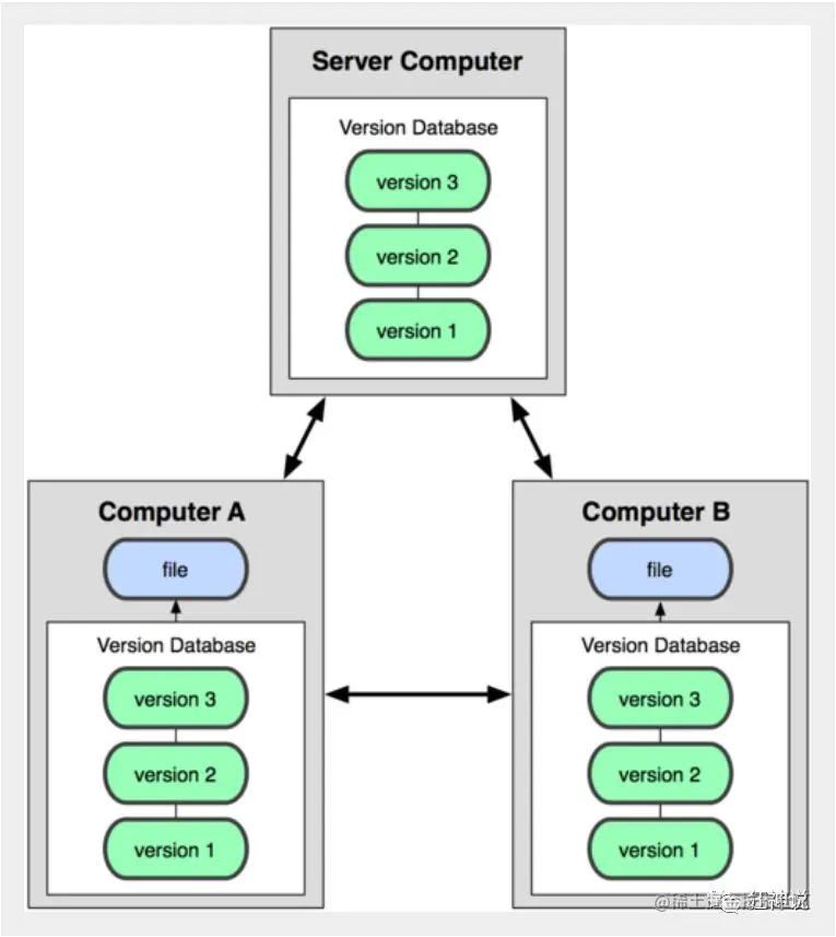 所有版本信息仓库全部同步到本地的每个用户,这样就可以在本地查看所有版本历史,可以离线在本地提交,只需在连网时push到相应的服务器或其他用户那里。由于每个用户那里保存的都是所有的版本数据,只要有一个用户的设备没有问题就可以恢复所有的数据,但这增加了本地存储空间的占用。
