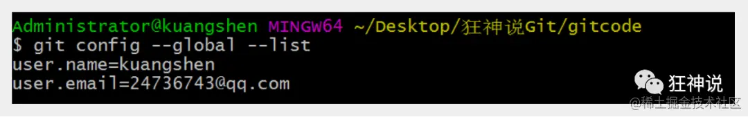 git config --global user.name "kuangshen" #名称git config --global user.email 24736743@qq.com #邮箱