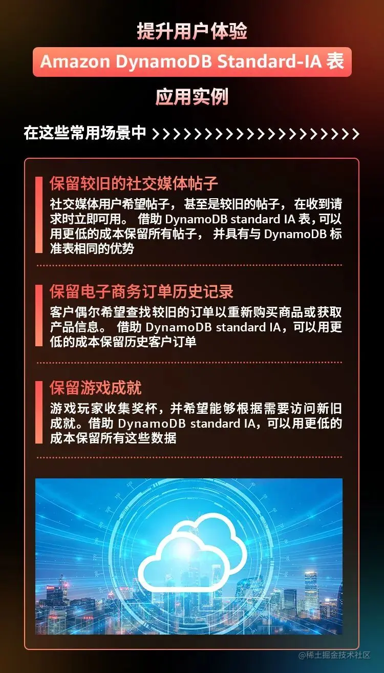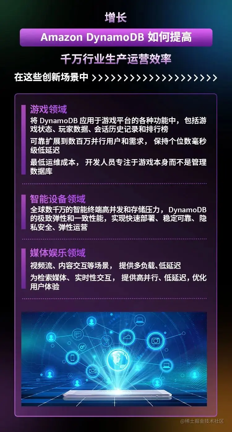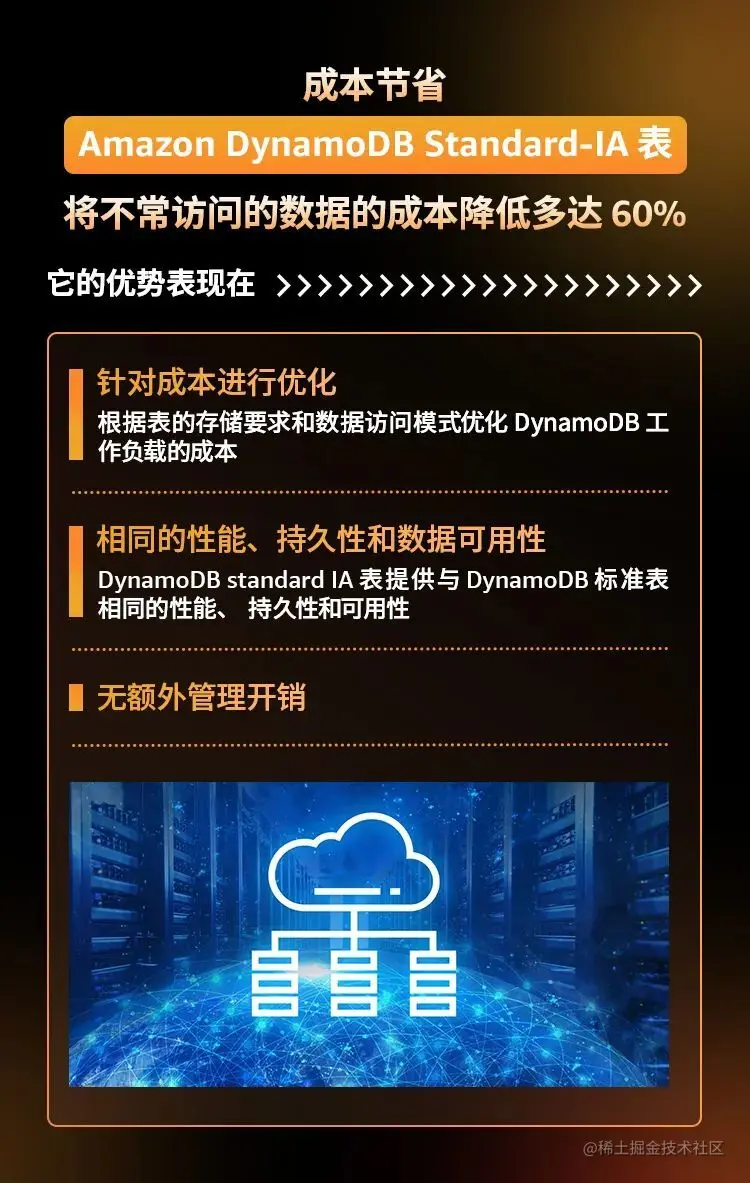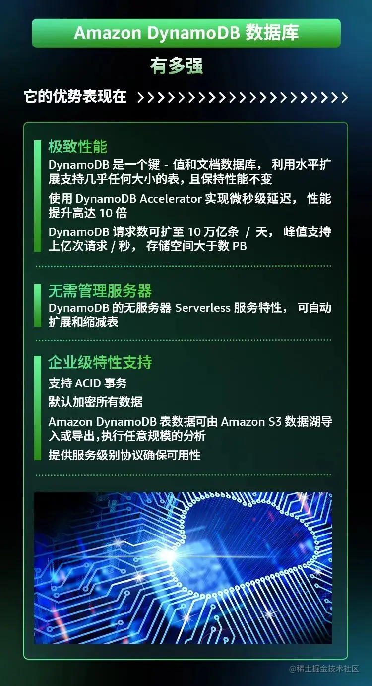 详细来说,Amazon DynamoDB 是一个键-值和文档数据库,这使 AmazonDynamoDB 能够拥有灵活的架构,可利用水平扩展支持几乎任何大小的表。其中性能实现由 Amazon DynamoDB Accelerator 实现微秒级延迟。另外 Amazon DynamoDB 是无服务器服务,无需预配置、修补或管理服务器,也不需要安装、维护或操作软件,可自动扩展和缩减表,以针对容量做出调整并保持性能。由于内置了可用性和容错能力,用户无需为这些功能构建应用程序。Amazon DynamoDB 提供预配置和按需容量模式,使用户能够通过指定每个工作负载的容量或只为您使用的资源付费,从而优化成本。