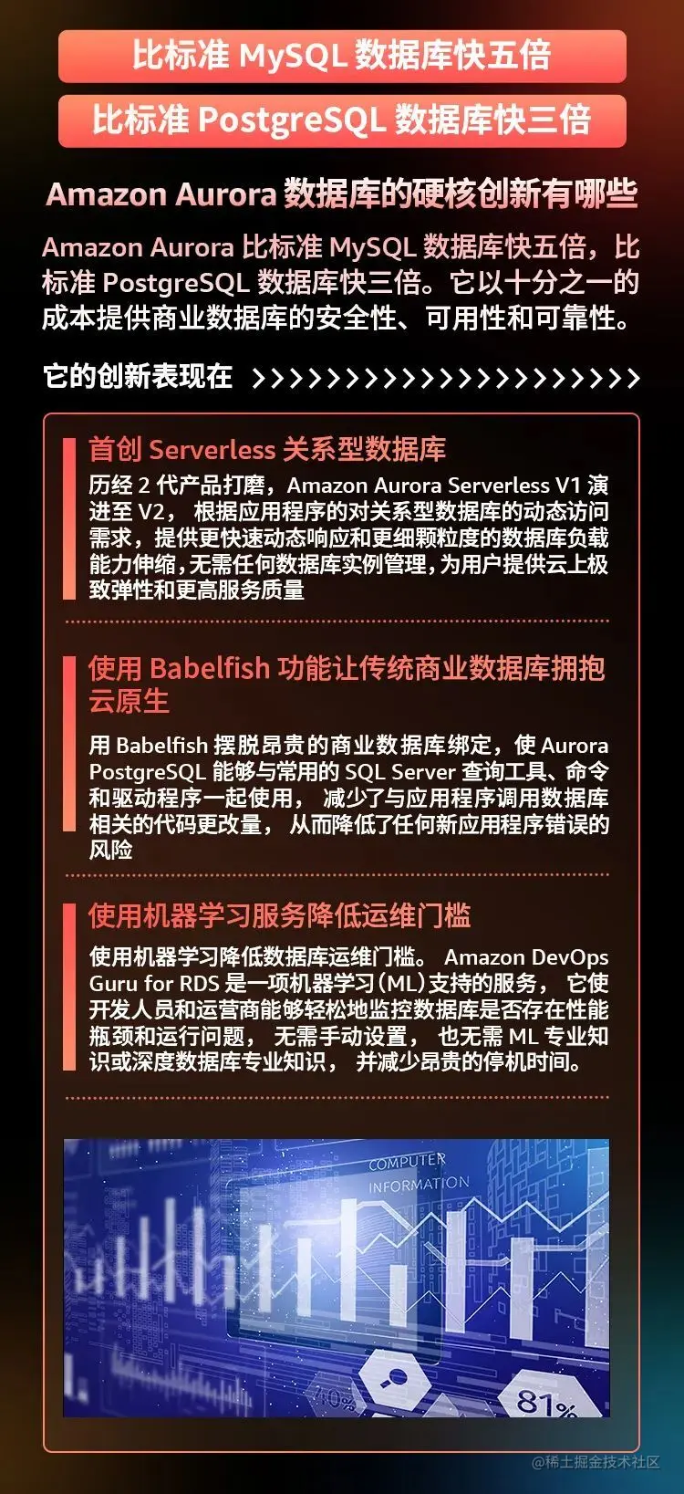 除了 Amazon DynamoDB,在关系型数据库领域中,亚马逊云科技又是如何应对关系型数据的挑战呢?Amazon Aurora 是一个与 MySQL 和 PostgreSQL 兼容的关系数据库,它为云计算而构建,将传统企业数据库的性能和可用性与开源数据库的简单性和成本效益结合在一起。