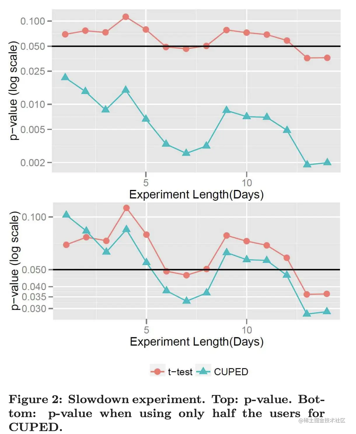 论文中作者在实际AB实验中检验了CUPED的效果。Bing实验检测检测加载时间对用户点击率的影响。 一个原本运行两周只有个别天显著的实验在用CUPED调整后在第一天就显著,当把CUPED估计用的样本减少一半后显著性依旧超过直接使用T-test.