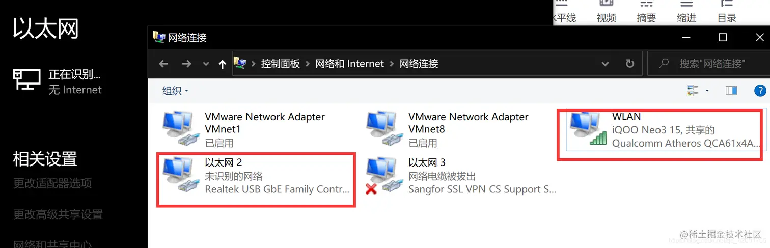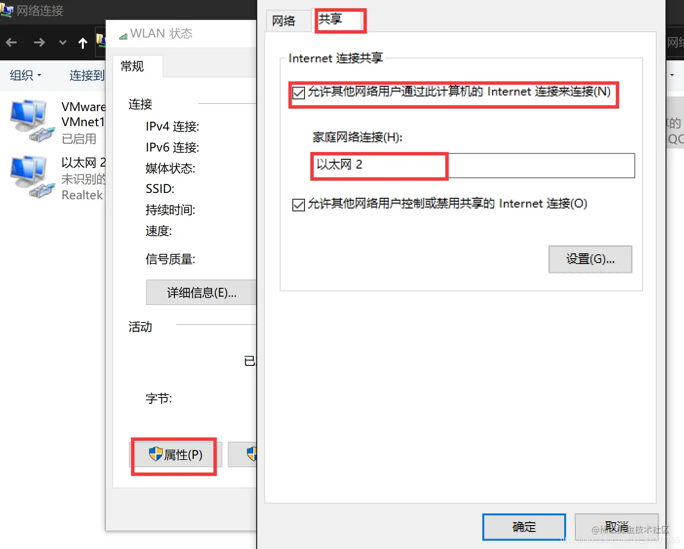 - 打开WLAN-》属性-》共享,打勾第一个选项,家庭网络连接选择以太网2(我的理解是把WIFI网络共享给以太网2了)