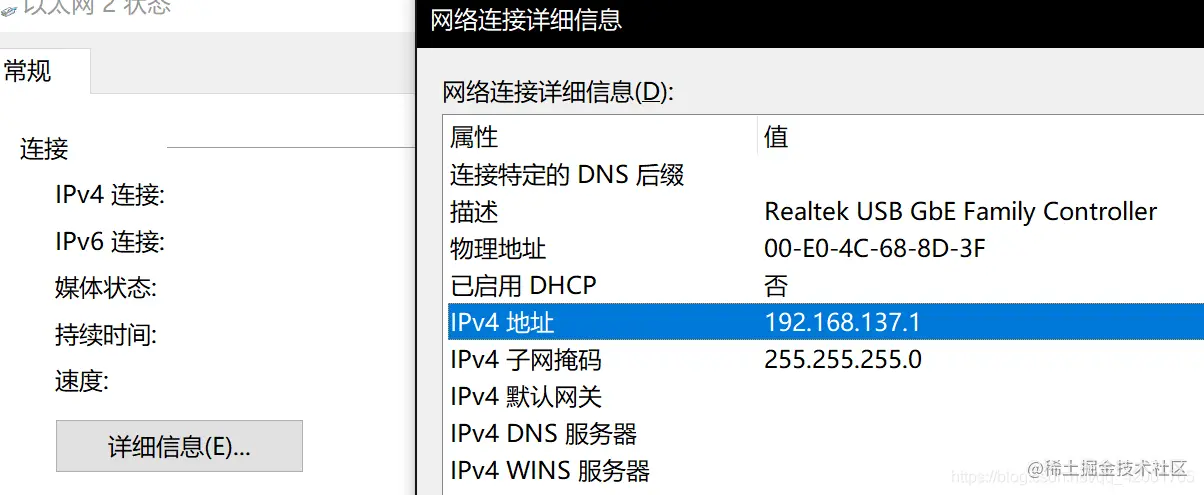 - 打开以太网2,点详细信息,可以看到IPV4是192.168.137.1。
