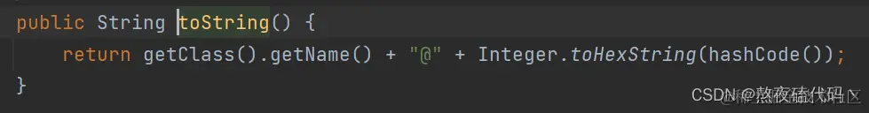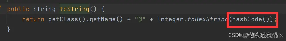 我们可以发现toString方法中有使用到这个方法,我们目前只需要知道它是一个内存地址,然后调用Integer.toHexString()方法,将这个地址以16进制输出。