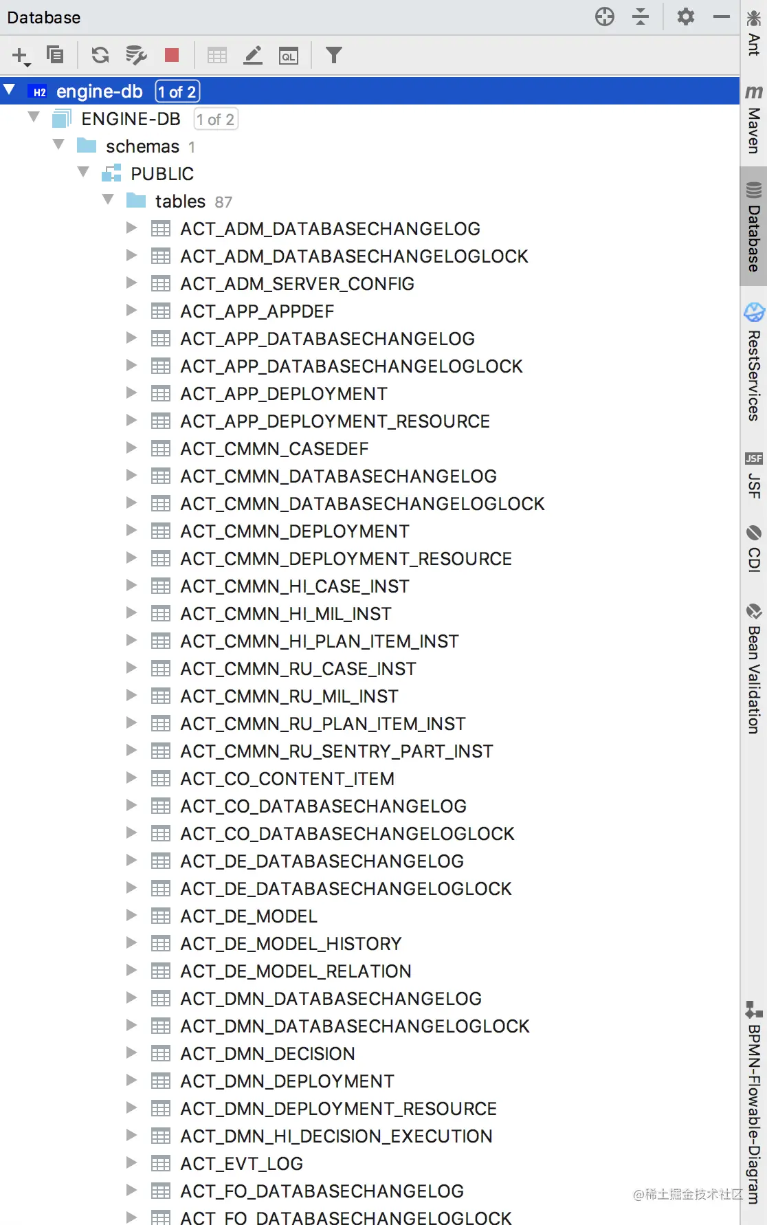 松哥在之前文章中给大家演示的所有关于 flowable-ui 的功能,涉及到的数据存储,我们现在都可以在连接上 H2 数据库之后进行查看。