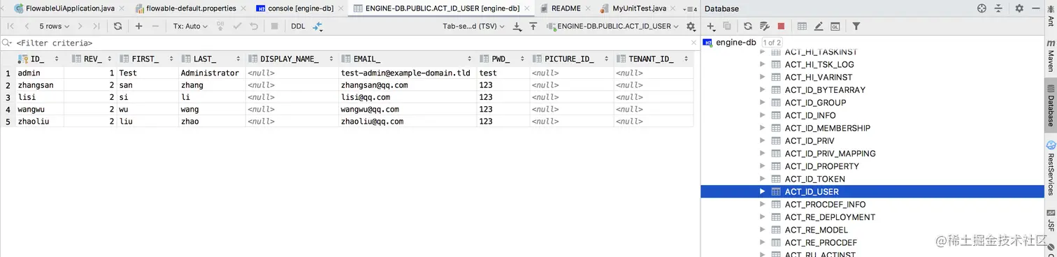 关于每张表的作用,松哥之前都已经写过文章和大家介绍过了,现在我们就去 ACT_ID_USER 表去看一下有没有刚刚创建的四个用户信息: