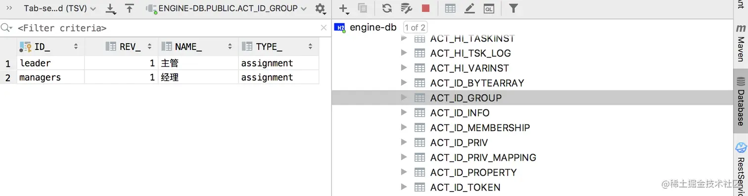 相同的道理,ACT_ID_GROUP 表中也可以看到我们创建的组信息:
