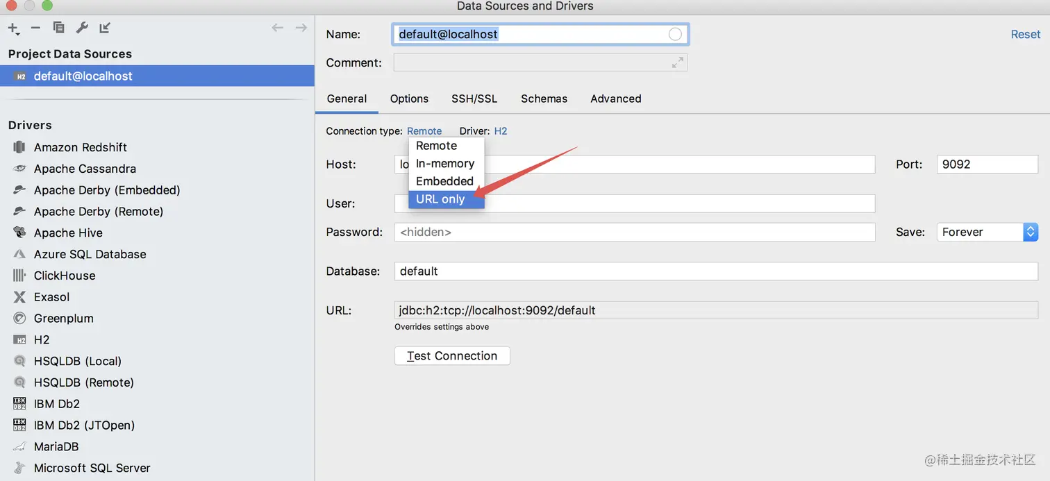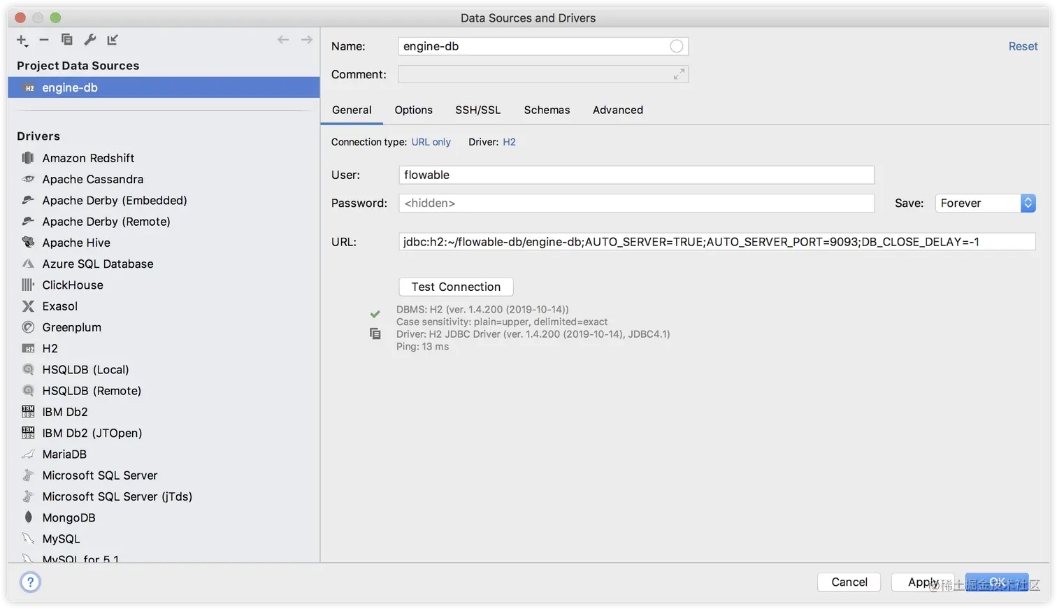创建完成之后,我们知道这些数据都是保存在 H2 数据库中,像连接 MySQL 一样,我们也可以连接 H2 数据库,为了省事,我这里就直接使用 IDEA 中自带的数据库连接工具进行连接了。