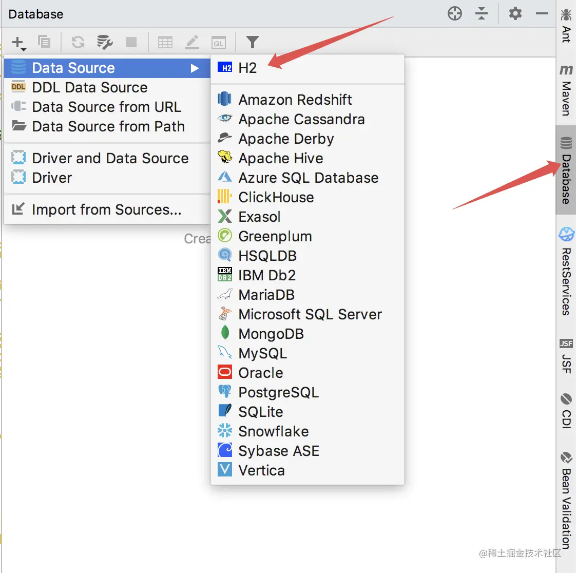 首先点击 Database,然后点击 + 添加一个数据源,选择 H2,如下: