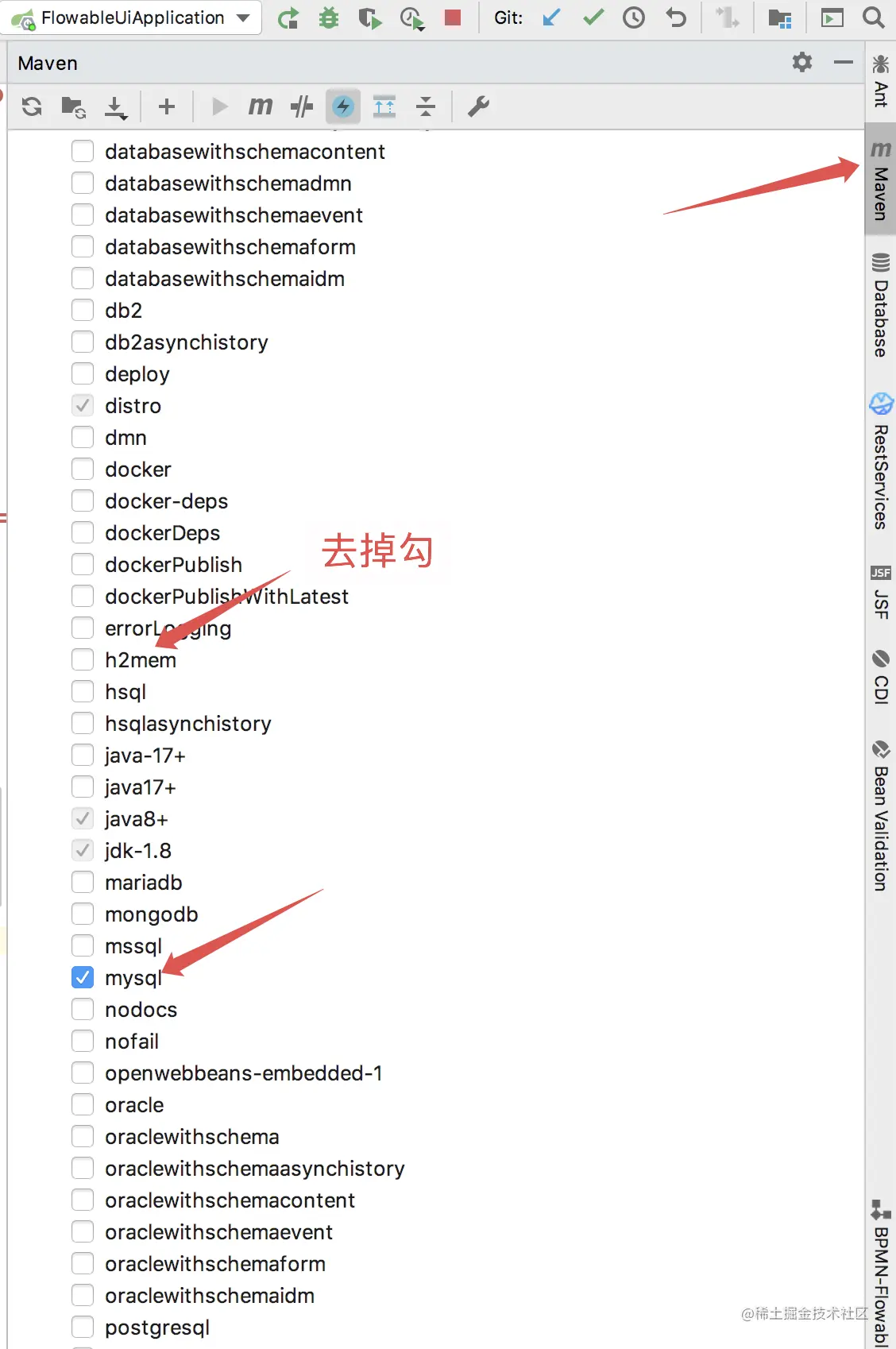 所以我们也可以不用自己手动加驱动,直接在在 IDEA 的 Maven 中,选择 profiles,去掉 h2mem,勾选上 mysql 即可,如下图: