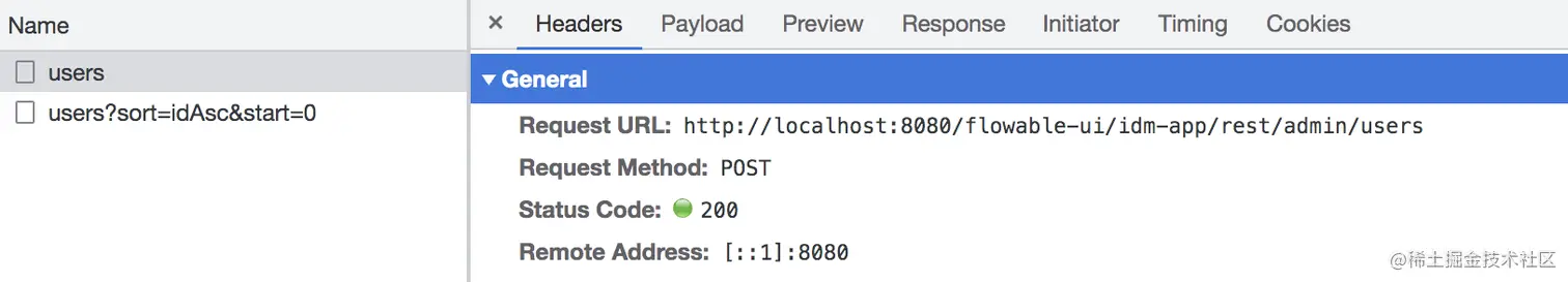 我举个例子,比如说我们想新建一个用户,那么我们在前端页面,打开浏览器 DEBUG 窗口,观察添加用户的时候操作的接口,如下: