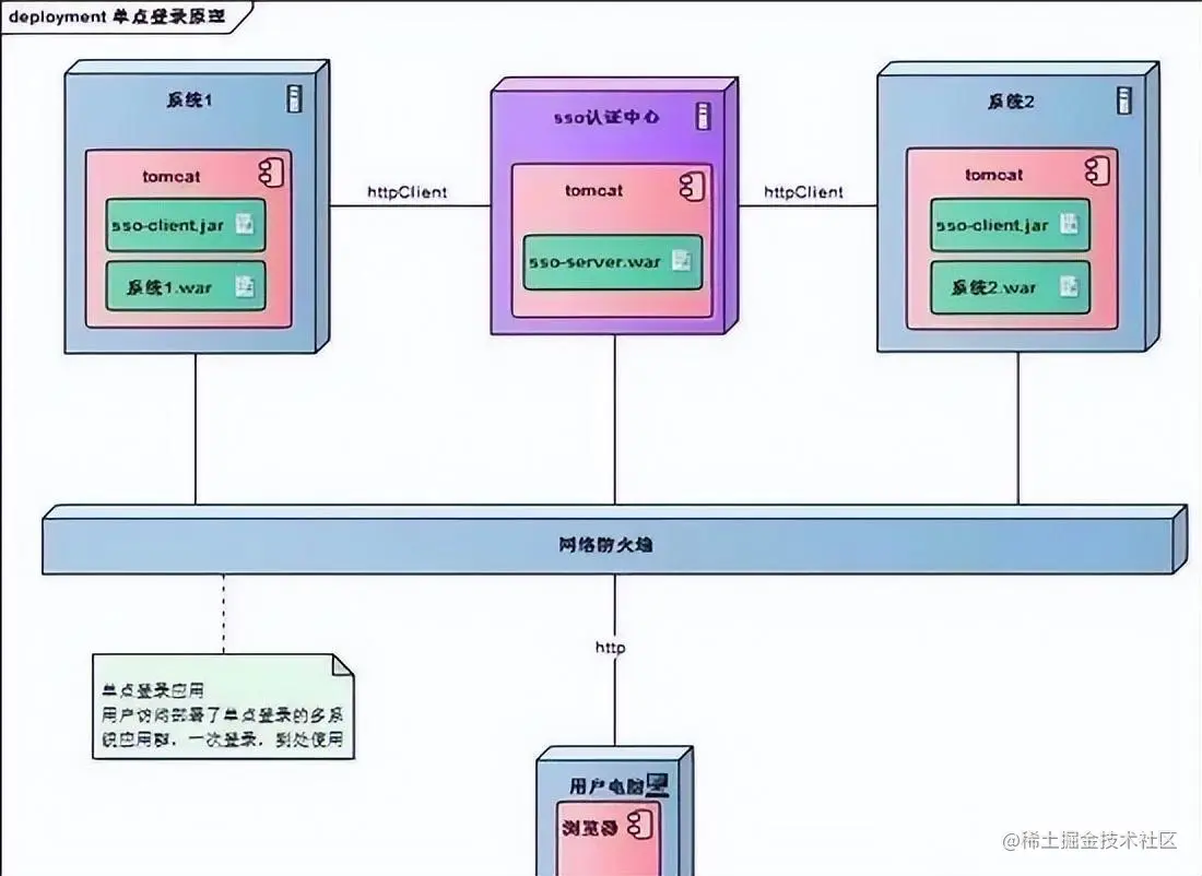 单点登录涉及sso认证中心与众子系统,子系统与sso认证中心需要通信以交换令牌、校验令牌及发起注销请求,因而子系统必须集成sso的客户端,sso认证中心则是sso服务端,整个单点登录过程实质是sso客户端与服务端通信的过程,用下图描述: