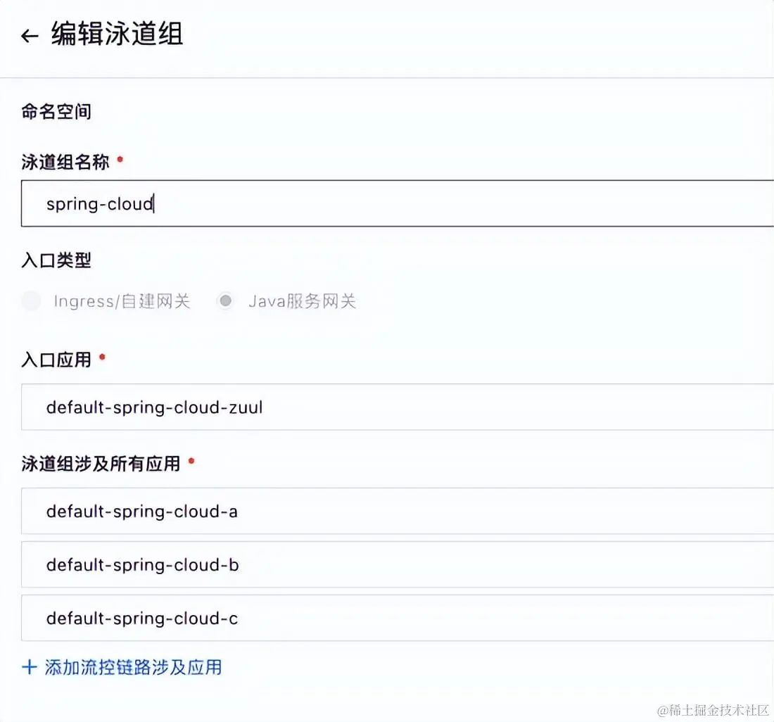 按照参考文档部署应用后,我们首先要区分线上流量和灰度流量。创建泳道组,将整个链路涉及到的应用全选: