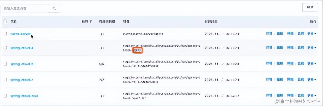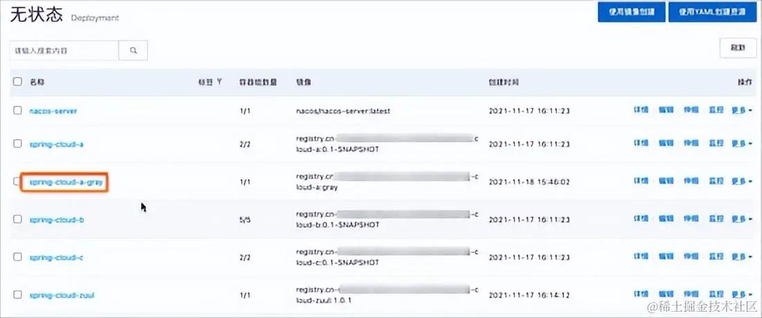 - 在无状态应用列表页面,spring-cloud-a-gray应用已经自动创建,并且它的镜像已经替换为spring-cloud-a:gray版本。
