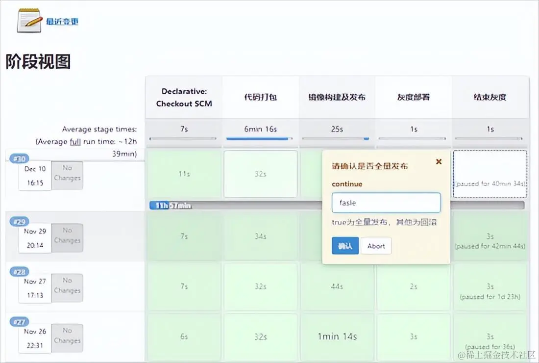 - 单击需要全量发布的阶段,在请确认是否全量发布对话框中输入 false,然后单击确认。