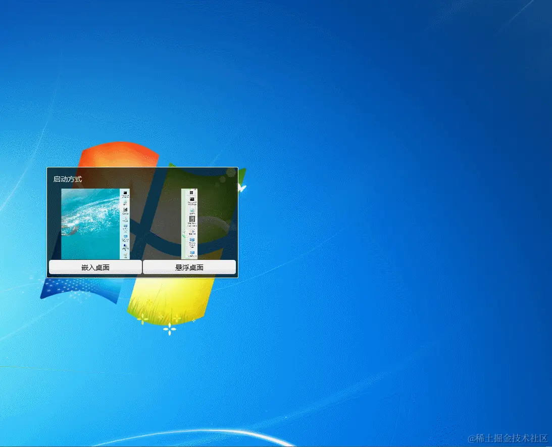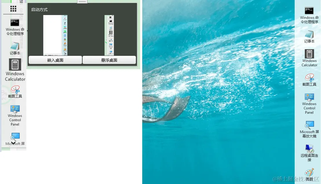 WPF 开发的实用小工具(附源码)持续更新(六)嵌入桌面 WPF开发者 2022-09-15 134 阅读1分钟 接着上一篇 点击链接加入群聊 【update】 1、嵌入桌面。 2、启动选择展现模式。 效果图 源码下载地址 gitee 下载解压后体验