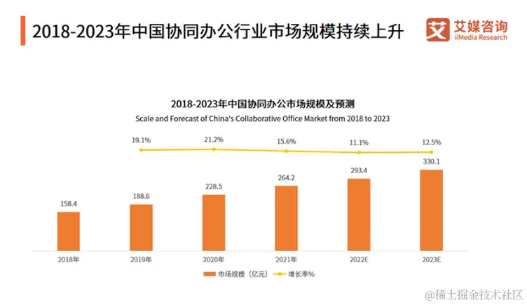 近年来,随着互联网行业的兴起,以即时通讯、在线会议、云文档等常用数字化功能为切入的移动办公软件开始兴起,部分代表性产品如钉钉和企业微信迅速占据大量市场份额。艾媒数据显示,2021年中国协同办公市场规模达264.2亿元,预计2021至2023年,中国协同办公行业将保持每年10%以上的增长率,2023年的市场规模将达330.1亿元。