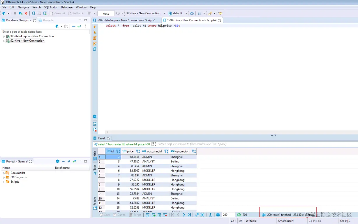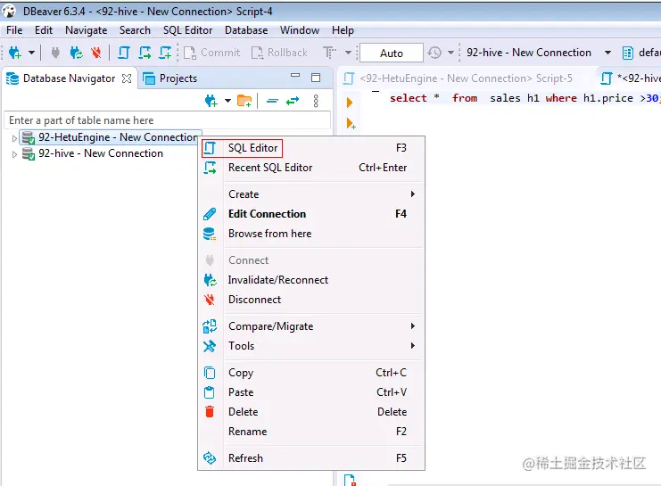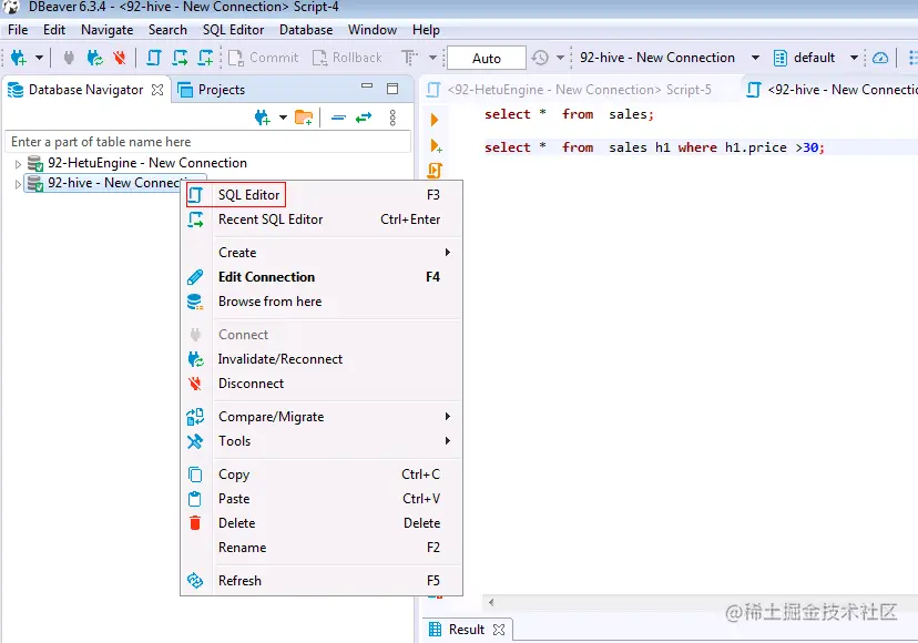 选择配置好的hive数据源92-hive - New Connection,右键选择SQL Editor