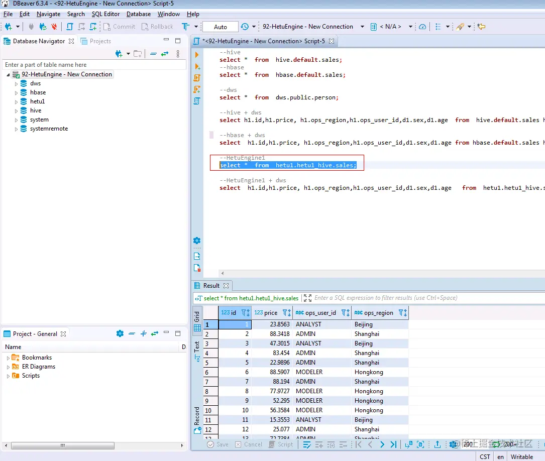 2)跨源分析体验,通过HetuEngine0连接集群内部数据源hive