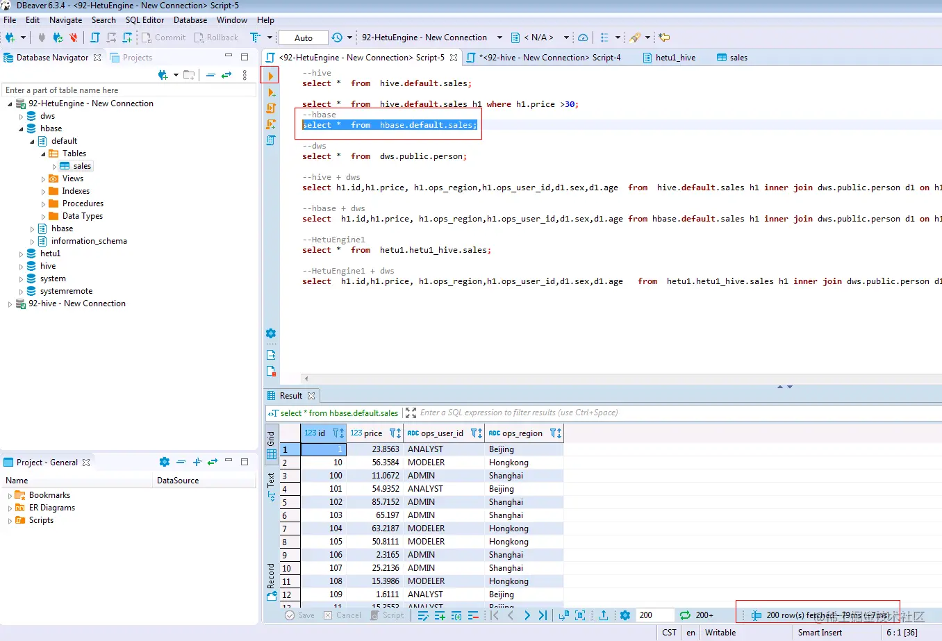3)跨源分析体验,通过HetuEngine0连接集群内部数据源hbase