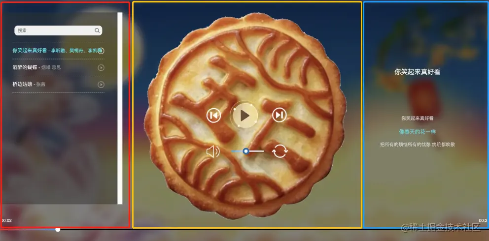 页面采用最简单的div+css进行布局,首先将页面分为三部分,分别为左边音乐列表,中间播放器部分和右边歌词部分。