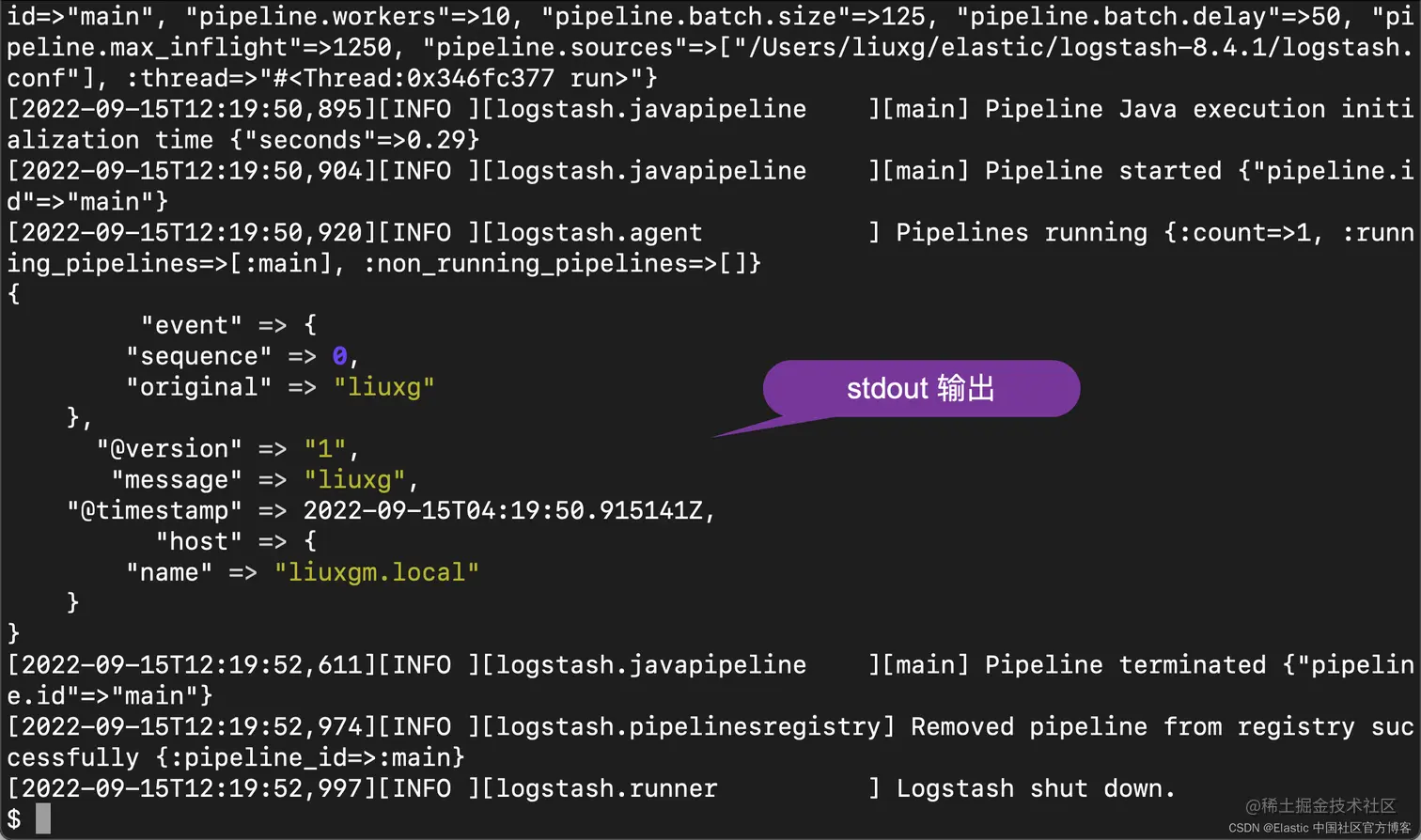 在上面的第一个部分,我们使用 generator 来生成一个 message。我们在 output 里定义两个输出,一个是 stdout,而另外一个是 elasticsearch output。我们查一下官方文档,并对它做如上的配置。需要指出的是: