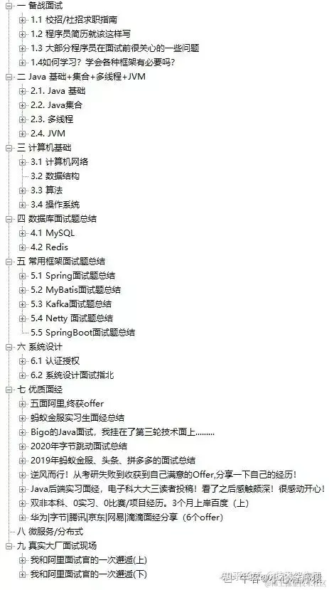 由于学校老师只教最基本的Java基础并且讲得也不好,基本全靠自学了,大一就有意识地在B站学习Java知识,从Java基础到基本流行框架到基本算法,一路走来发现程序员一定要培养自学能力,我秋招大厂也面试过字节、百度等,并且都面到HR那关,由于自己没有实习经历,加上学历也不是很好,很自然被内卷淘汰掉了,大厂其实就是比学历比能力,你能力别人可以从实习经历看出来,强烈建议学历没什么优势的小伙伴一定要实习,能进大厂实习是最香的,进不了一线大厂 也可以进二三线厂。感谢这份网上 一位大神分享的面试笔记,让我有了去大厂实习的机会,甚至有了选择去哪家大厂实习的机会。