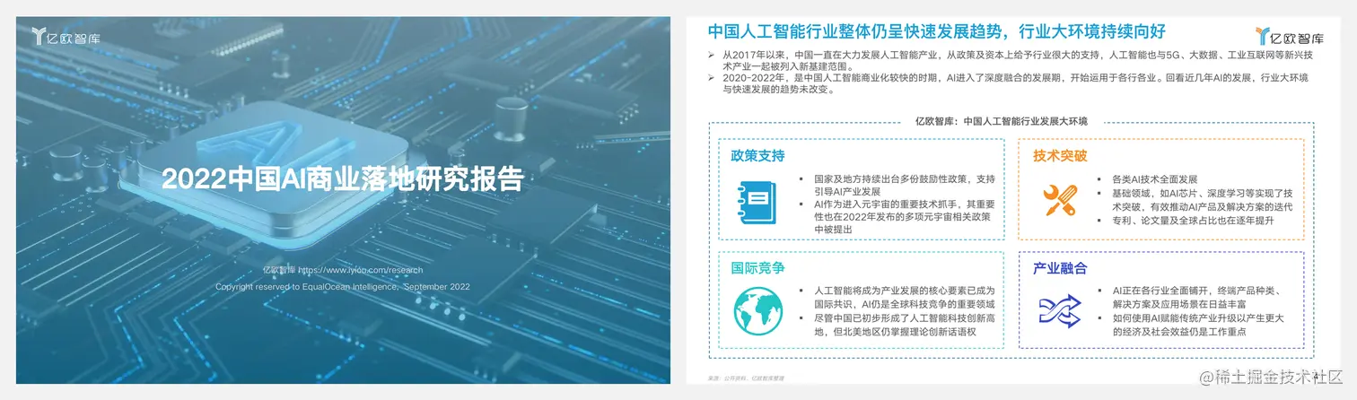 亿欧在2022世界人工智能大会『AI商业落地论坛』上发布《2022中国AI商业落地研究报告》及《2022中国AI商业落地TOP100企业榜单》,从政策支持、技术发展、产业融合、投融资市场等角度出发,结合国内外竞争格局变化,解析2022年中国人工智能产业背景。