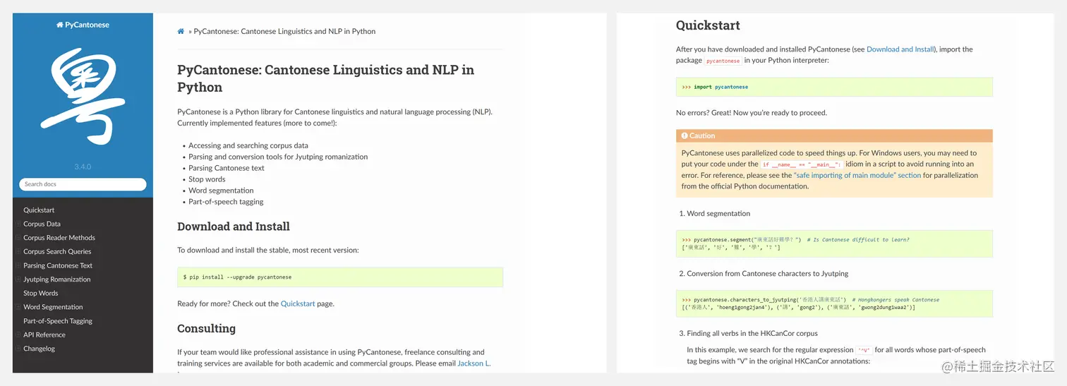 PyCantonese 是一个用于粤语语言学和自然语言处理(NLP)的 Python 库,支持的功能包括:语料库数据、解析和转换工具、解析粤语文本、停用词、分词、词性标注。