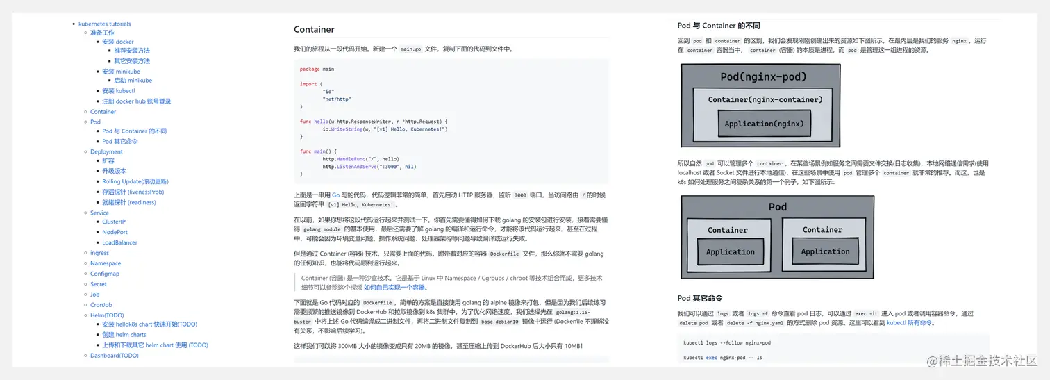 k8s 作为云原生时代的操作系统,学习它的必要性不言而喻!这是一份非常优质的 k8s 教程,需要注意的是,教程侧重于实战引导,以渐进式修改代码的方式,从最基础的 container 容器的定义开始,经过 pod、deployment、servcie、ingress、configmap、secret 等资源直到用 helm 来打包部署一套完整服务。