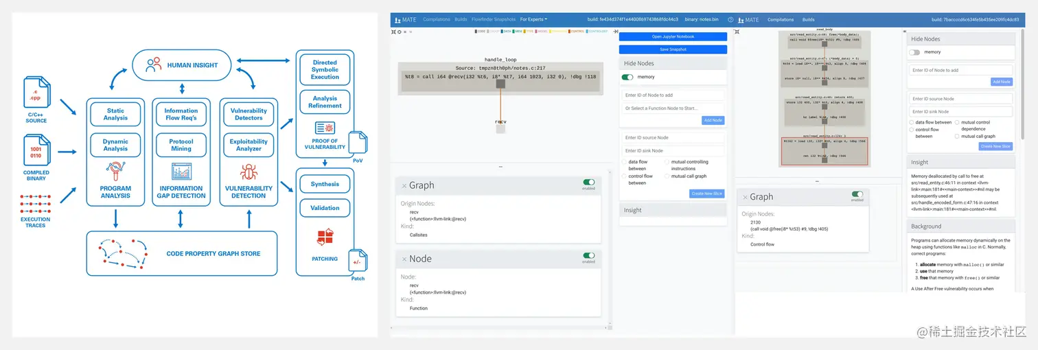 MATE 是一套用于交互式程序分析的工具,用于寻找 C 和 C++ 代码中的漏洞。MATE 使用代码属性图(CPG)将特定应用和低级漏洞分析统一起来,从而能够发现高度特定应用的漏洞,这些漏洞取决于目标 C/C++ 程序的实现细节和高级语义。