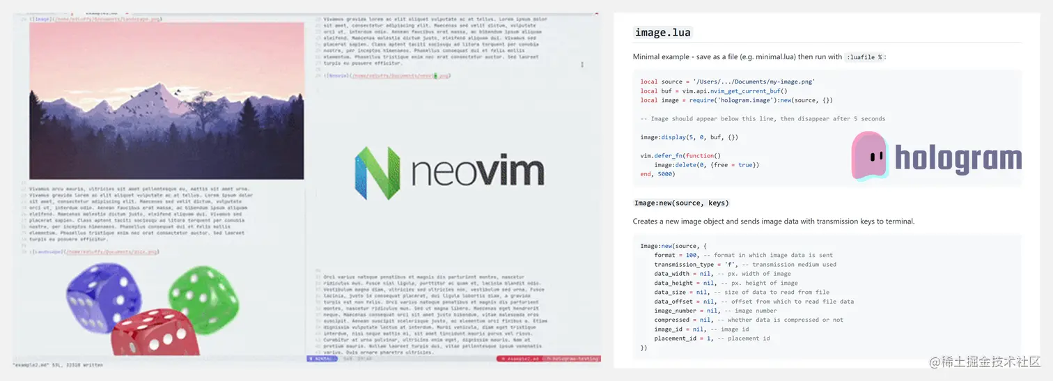 hologram 是 Neovim 的一个跨平台终端图像查看器,可扩展且速度快,用 Lua 和 C 语言编写。它可以在 macOS 和 Linux 上工作,目前支持 Kitty 图形协议。
