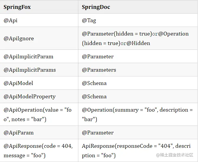 - 我们先来看下经常使用的Swagger注解,看看SpringFox的和SpringDoc的有啥区别,毕竟对比已学过的技术能该快掌握新技术;