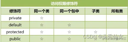 Java是使用“访问控制符”来控制哪些细节需要封装,哪些细节需要暴露的。Java中4种“访问控制符”分别是private、default、protected、public,他们说明了面向对象的封装性,所以我们要利用它们尽可能的让访问权限降到最低,从而提高安全性。