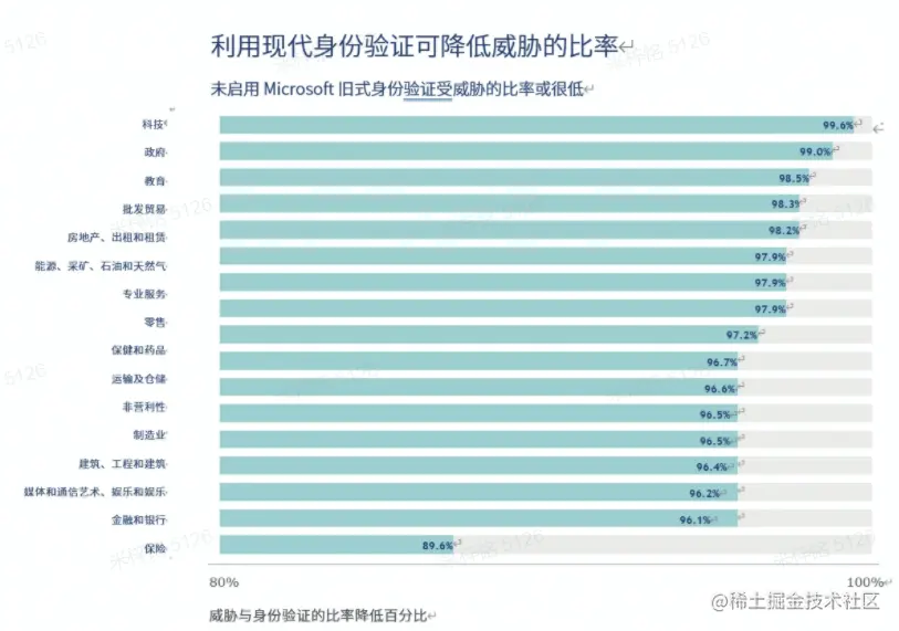 更为值得一提的是,据报道,使用现代身份验证可降低企业安全威胁的比率在金融、科技、零售、制造业等 16 个领域均超过 95%,排名前五位的分别是科技领域(99.6%)、政府领域(99%)、教育(98.5%)、批发贸易(98.3%)、房地产、出租与租赁(98.2%)。
