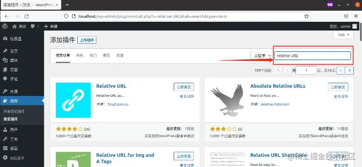 想要让本地的WordPress网站发布到公共互联网,我们需要先安装一个相对url插件(这里我们使用relative url),我们只要在WordPress仪表盘的“插件”页面,就能搜索、安装并启用。