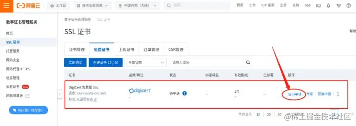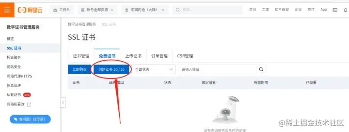 在证书购买完成后,我们会自动跳转回上一级页面,这时我们就能看到“创建证书”按钮已经显示出“20/20”(即拥有20张证书,其中20张未使用),点击“创建证书”按钮,将我们的域名与证书绑定在一起。