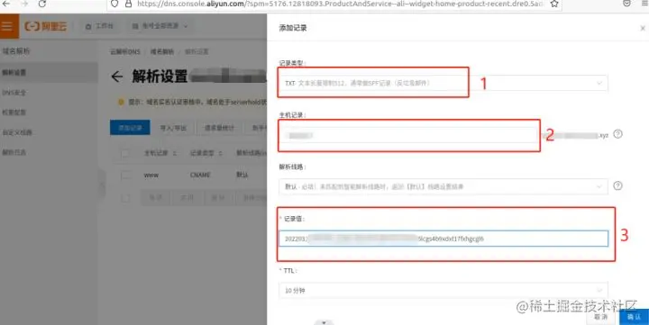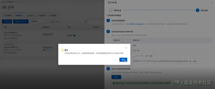 在DNS解析页面,我们主要填写的内容就是记录类型(选择TXT),主机记录(填写www)和记录值(申请域名绑定证书时生成的那一串复杂字符)三项,通常这三项会自动填入(不换账号情况下),在确认信息无误后,直接点击下方的“确认”按钮。并在下一页点击“验证”。