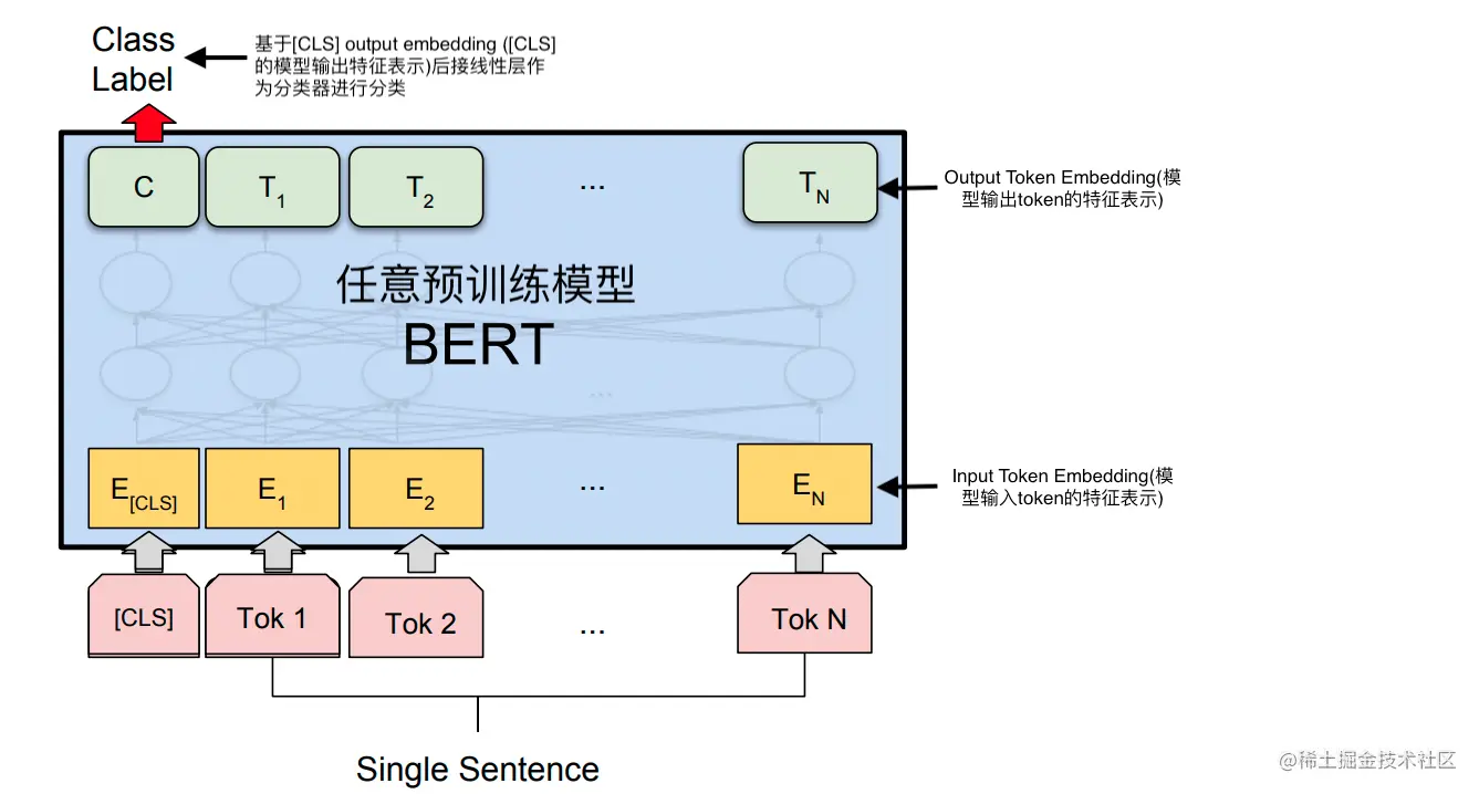 基于预训练模型微调的想法非常简单直接,也即将[CLS]的模型输出特征表示作为输入句子的特征表示,通常为768维或1024维的向量,然后接入一个线性分类器(通常为单层全连接层)进行文本分类任务训练。