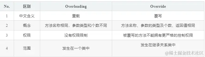 - Overloading 和 Override区别:\