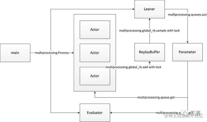 3.参数同步使用multiprocessing里的Queue通信,每个Actor分配一个独占的Queue
