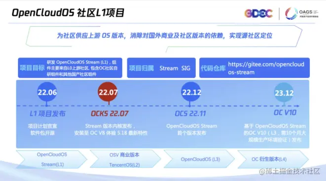 自 6 月 22 日在社区开放日上发布首个源社区(L1)项目及首个全量软件包(L3)版本后不久,在 2022 开放原⼦全球开源峰会 OpenCloudOS 分论坛上,OpenCloudOS 开源操作系统社区正式发布首个 Linux 源社区(L1)内核版本 OCKS 2207,适配主流服务器硬件设备。
