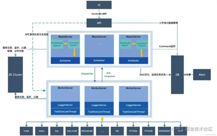 随手盗用一张官网的系统架构图,可以看到调度系统采用去中心化设计,由UI,API,MasterServer,Zookeeper,WorkServer,Alert等几部分组成。