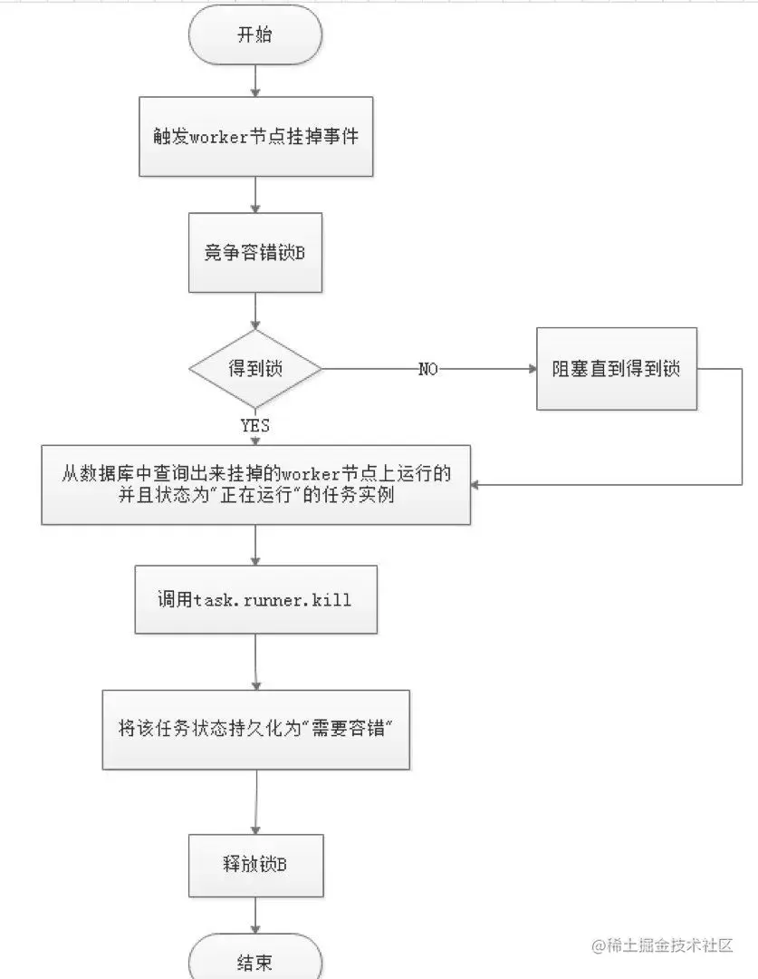 其中Master监控其他Master和Worker的目录,如果监听到remove事件,则会根据具体的业务逻辑进行流程实例容错或者任务实例容错,容错流程图相对官方文档里面的流程图,人性化了些,大家可以参考一下,具体如下所示。
