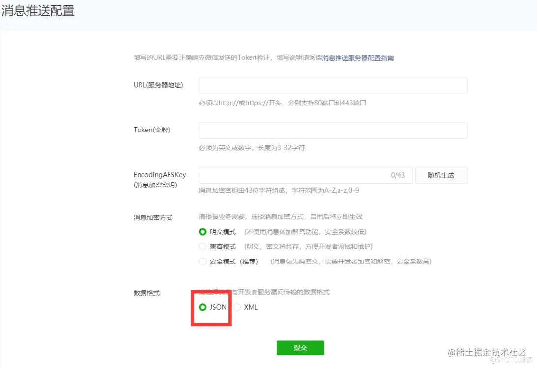此时,回到微信公众平台,使用管理员登录,按照此路径操作:开发 → 开发设置 → 消息推送;在配置界面中,将美洽工作台内生成的接入配置,粘贴到对应的位置。特别注意:消息格式要选用 json。