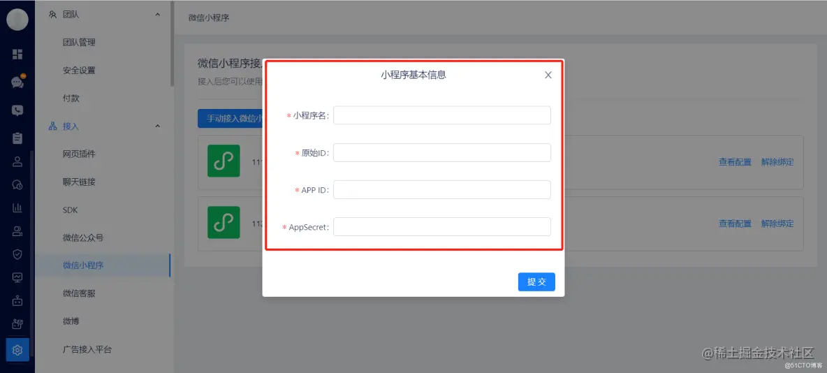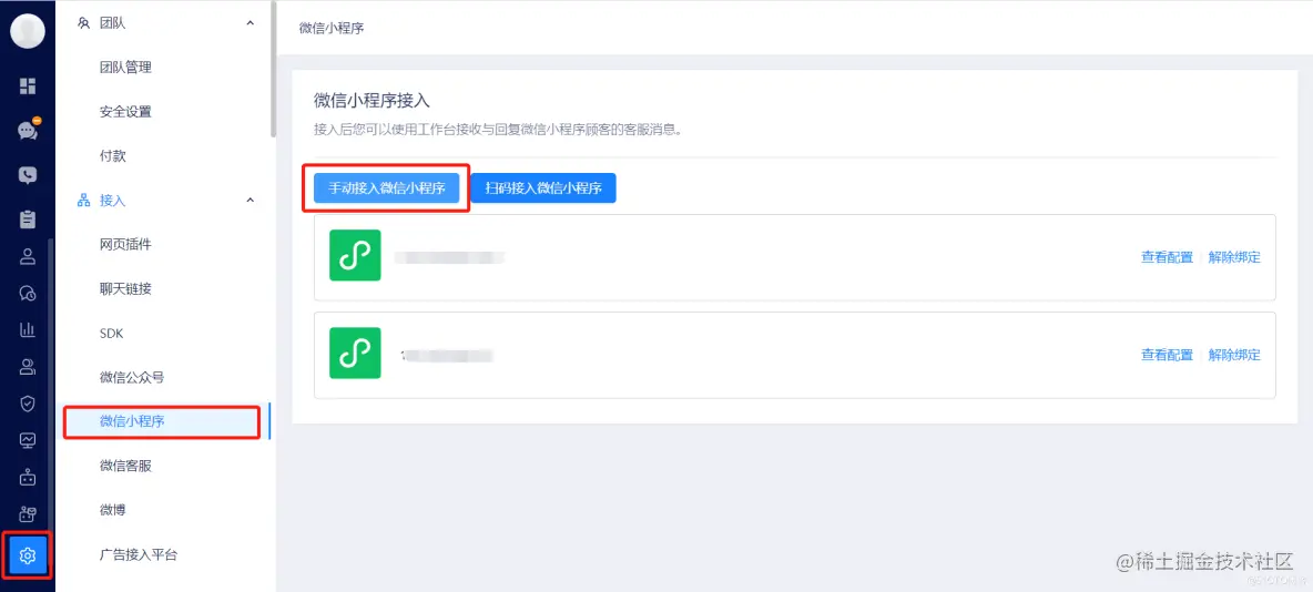 首先,小游戏需要通过手动配置的方式接入,登录美洽工作台后,路径为:设置 → 接入 → 微信小程序;