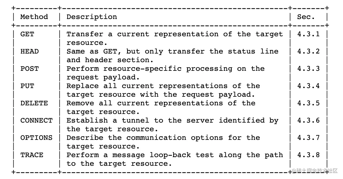 回顾下 HTTP 协议,最广为认知的是对 HTTP Mehod 的约定,使用 9 个单词就完成了对基本动作的规范,为开发者提供了清晰的思维模型: